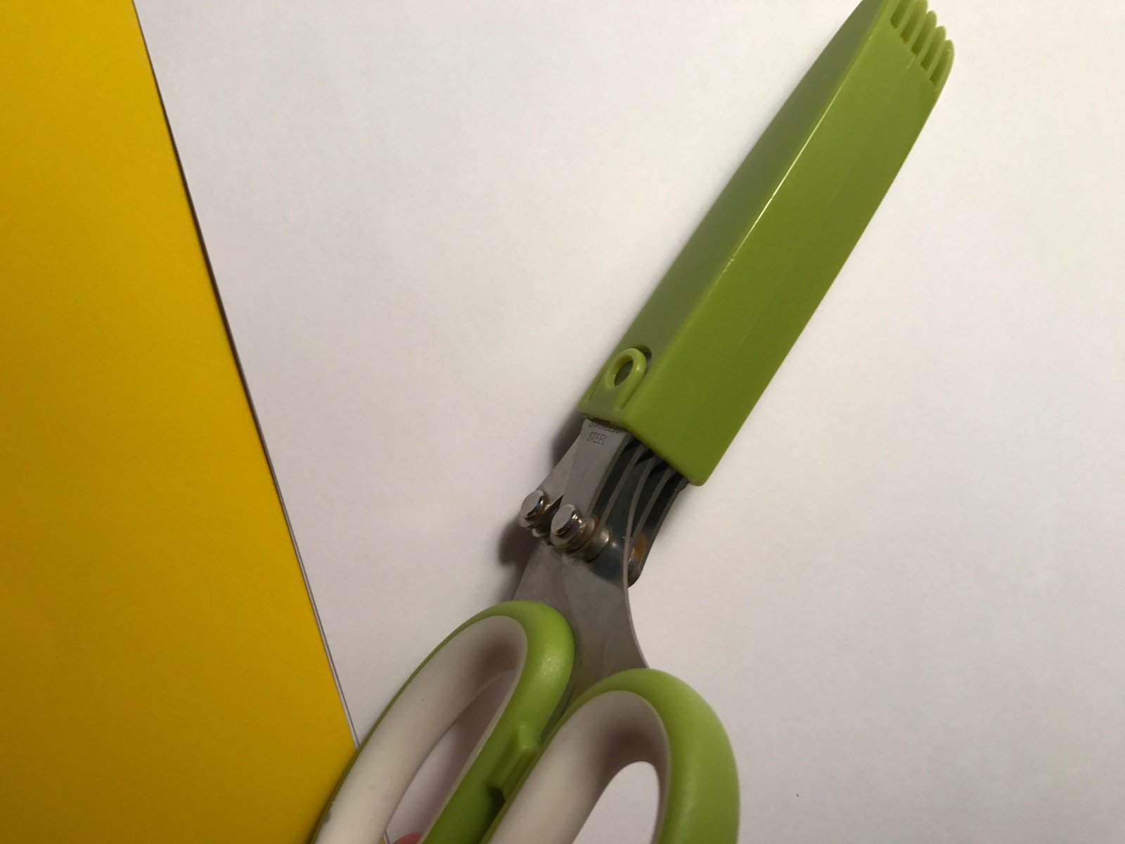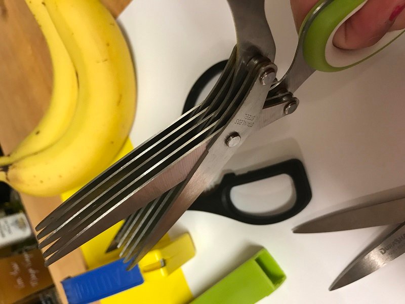 These scissors are great if you like to use fresh herbs, as I do. With one cut, a small bundle of chives is cut into small, garnish size tidbits.