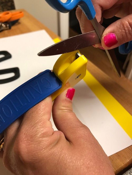 I like this scissor sharpener because it is easy to control. I open the scissors and just slide one blade at a time across the carbide edge.