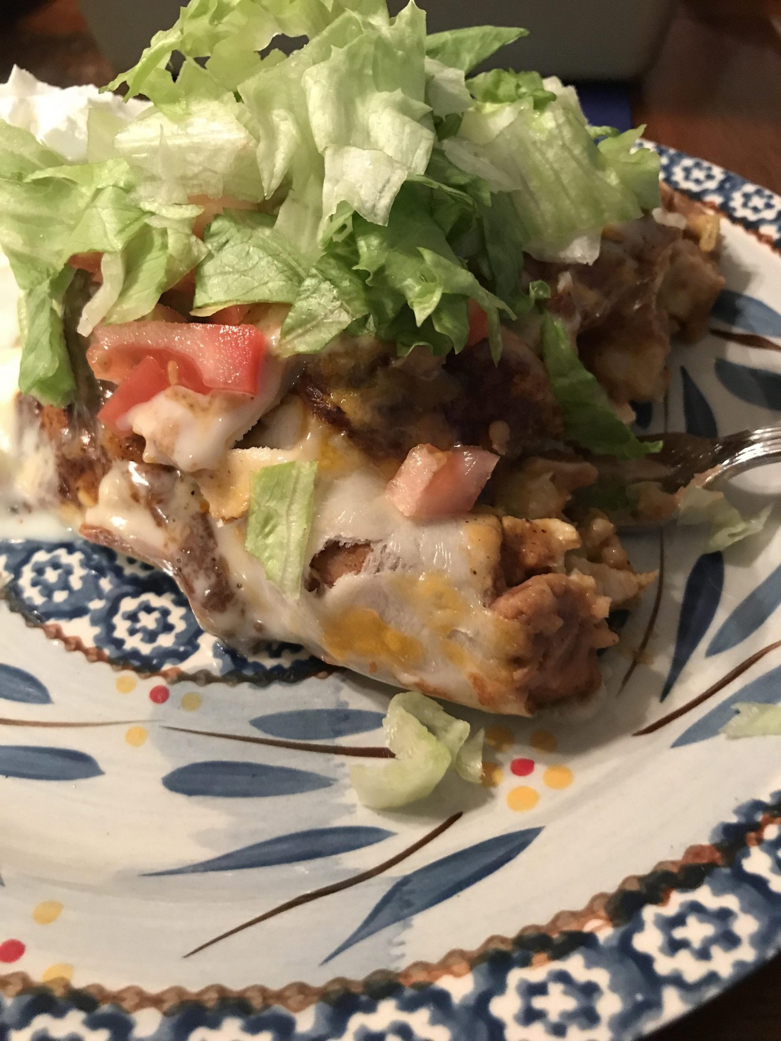 - Sprinkle some of the chicken/onion mixture on top of the beans. I just used my hands.