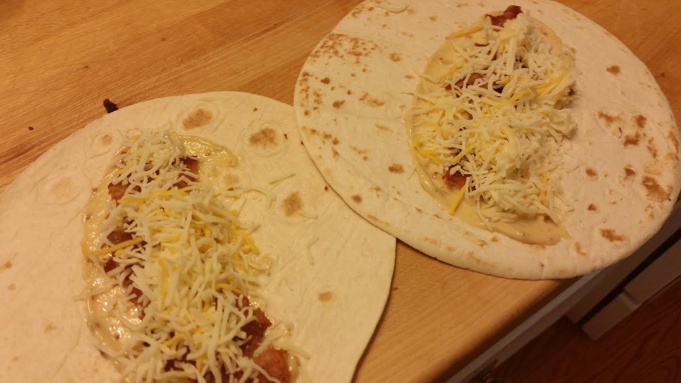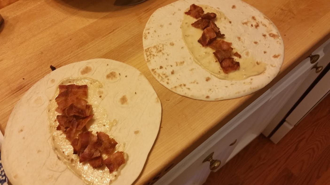 This aioli by Stonewall Kitchen is so light and a great addition to anything containing bacon. Since I had a few slices of bacon leftover and this was going to be a “breakfast” dish, I decided to use the aioli as a sauce, at the base of each burrito. The aioli added a sweet, syrupy flavor (not texture) to the tortilla. However, I think next time, I will try cream cheese as the base.