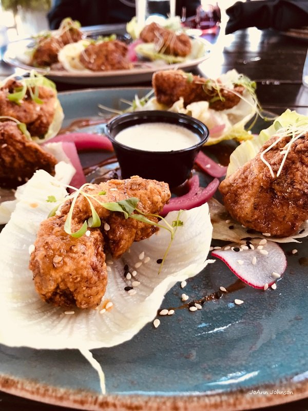 One of their best cocktails is the Reedy Peach, sweet, crisp and refreshing, it pairs nicely with their chicken lettuce wraps. Chicken tenders deep-fried, wrapped in large lettuce leaves and served with a mayonnaise based aioli.