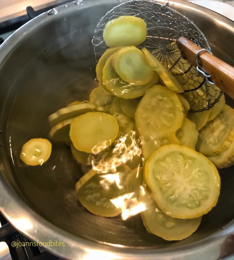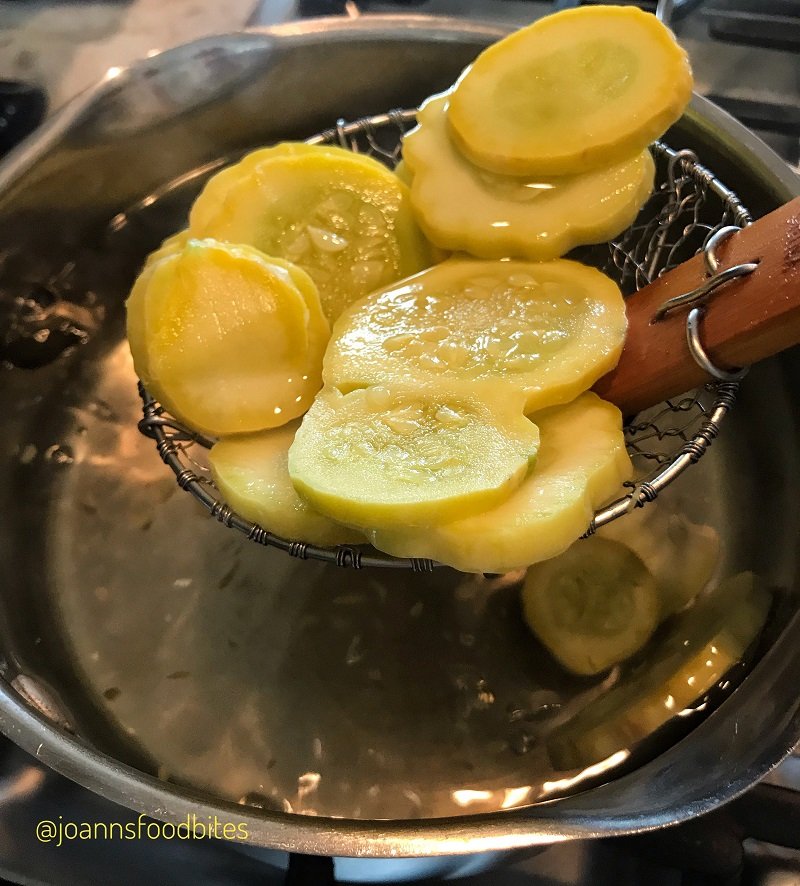 I use a spider and place the slices in the ice bath for approximately 2-3 minutes to stop the cooking process. Do not allow the squash to sit in the ice batch for any longer.