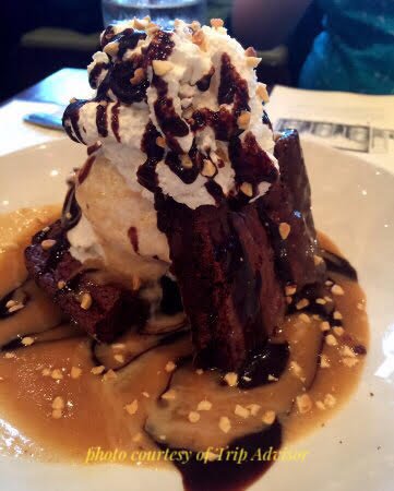 Triple Chocolate Hill is a mountain of vanilla ice cream layered with a double fudge brownie, topped with a peanut butter caramel sauce, chocolate sauce, and whipped cream.