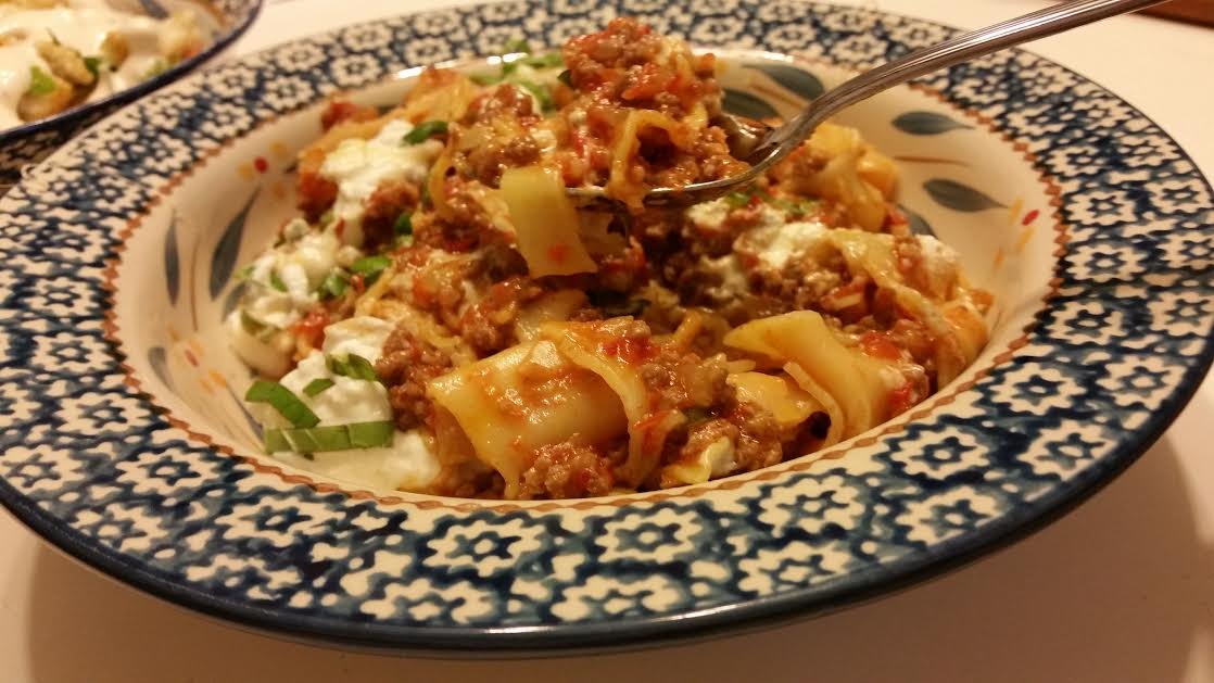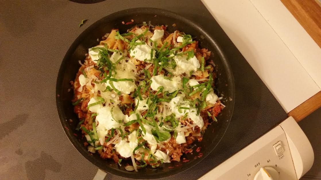 This Meaty Skillet Lasagna is simple and requires only a 10″ non-stick skillet for cooking.
