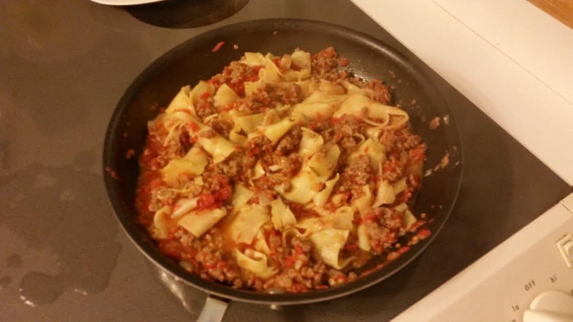 Scatter pasta pieces over the meat, then pour processed tomatoes over pasta. Do not stir it at this time.
